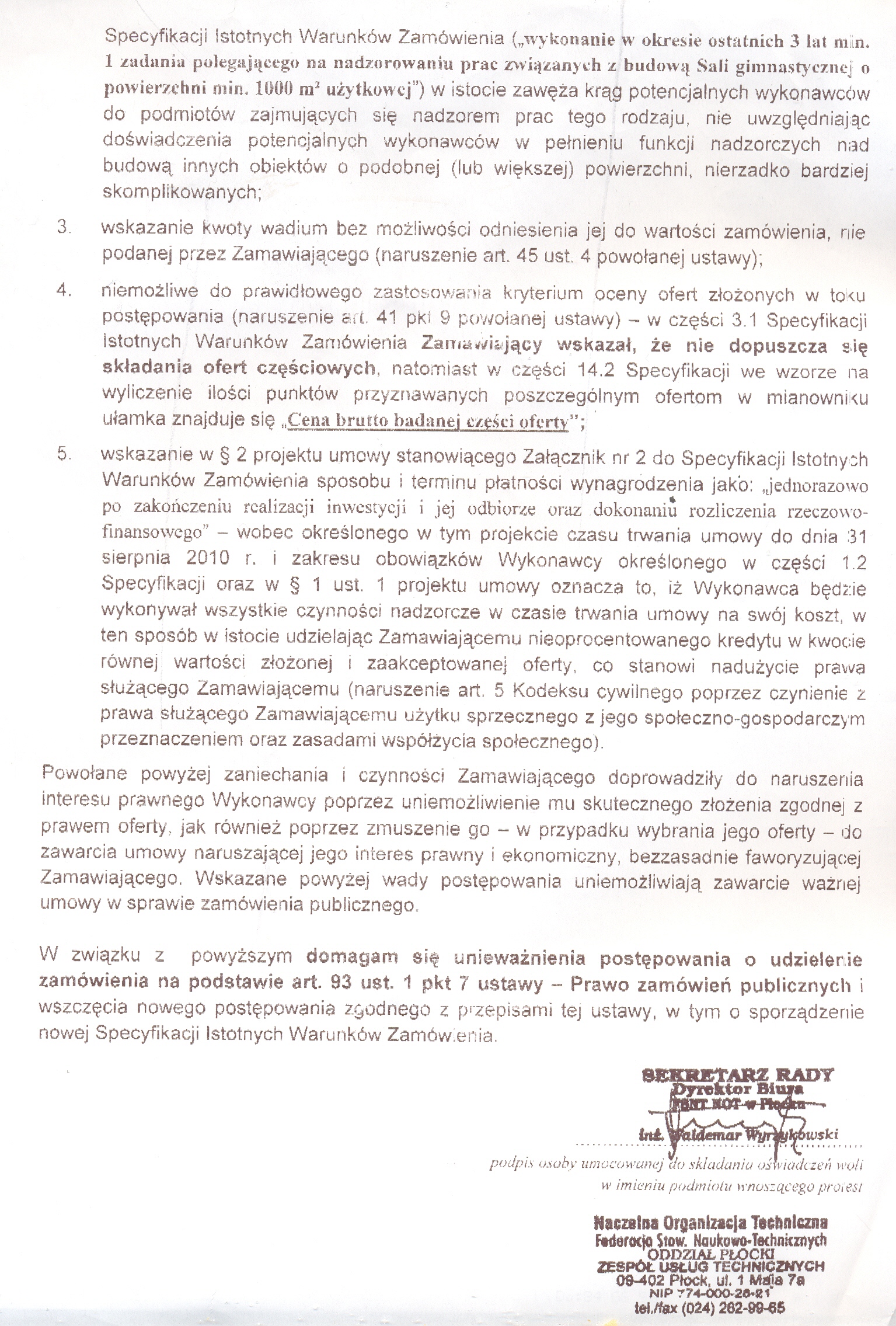Na podstawie art 181 ust 3 ustawy z dnia 29 stycznia 2004 r. - Prawo zamówień publicznych (Dz. U. z 2007 r. Nr 223, poz. 1655 z zm.) informuję, iż w dniu 27 marca 2008 r. wpłynął protest do postanowień Specyfikacji Istotnych Warunków Zamówienia, ktorego kopię przedstawiamy poniżej. Jednocześnie wzywamy wykonawców do wzięcia udziału w postępowaniu toczącym się w wyniku wniesienia protestu.
