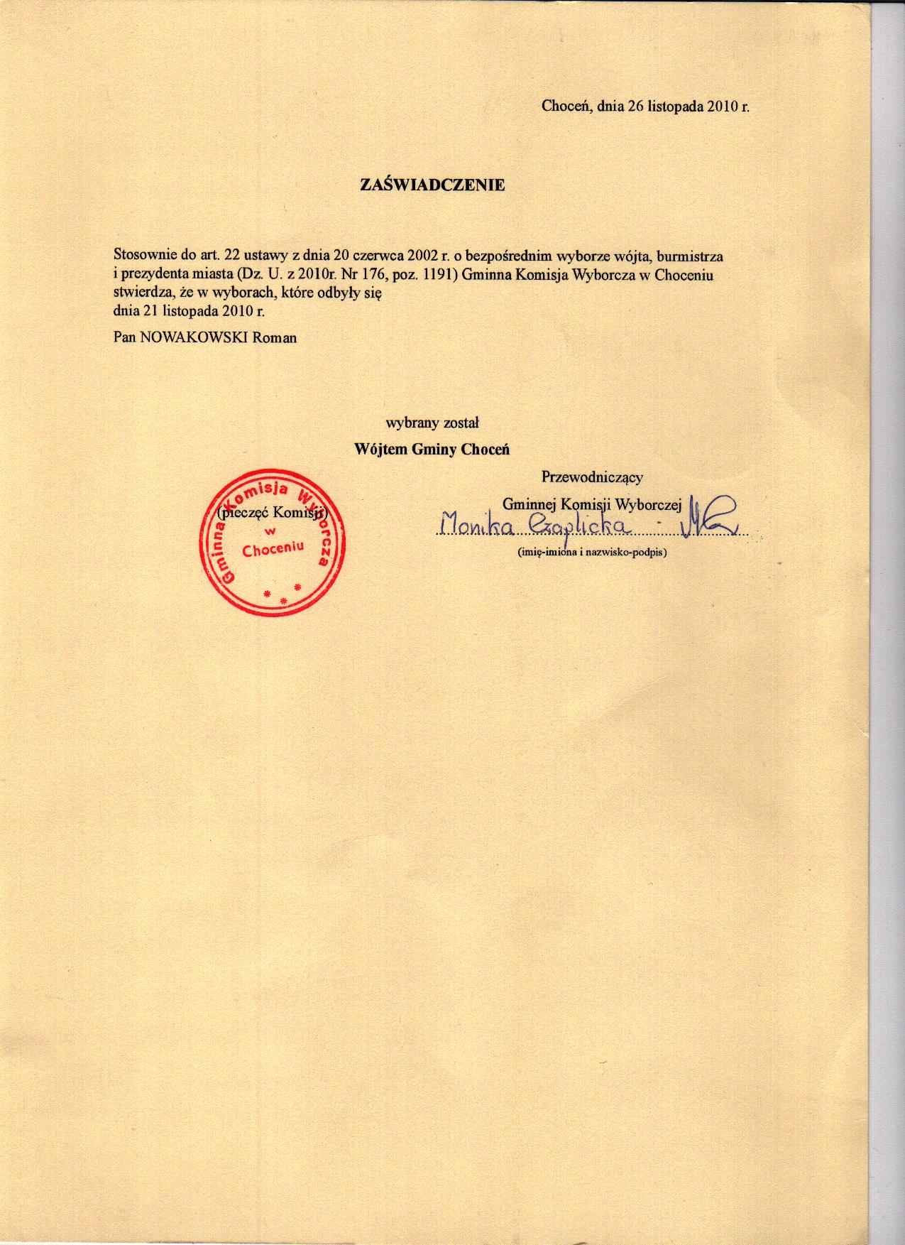 - Zaświadczenie o wyborze Wójta Gminy (361kB)